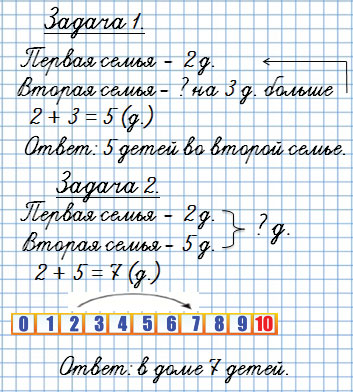 2. В доме живут две семьи. В первой семье двое детей, а во второй — на 3 ребёнка больше. Сколько детей во второй семье? Сколько всего детей живёт в этом доме?