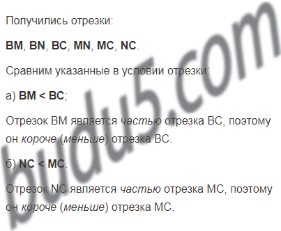 Начертите отрезок ВС и отметьте на нём точки М и N так, чтобы точка М лежала между точками В и N. Запишите все получившиеся отрезки с концами В, М, N и С. Сравните отрезки: