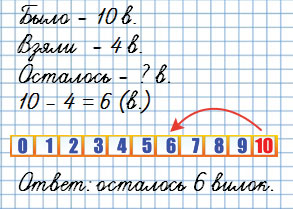 Составляю задачу: В коробке было 10 вилок. К обеду взяли 4 вилки. Сколько вилок осталось в коробке?