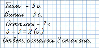 4. В пакете 1 л вишнёвого сока. Это 5 стаканов. Ваня выпил утром 2 стакана сока и вечером ещё 1 стакан. Сколько всего стаканов сока он выпил? Сколько стаканов сока осталось?