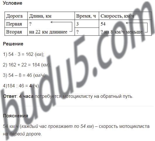Мотоциклист проехал расстояние от одного города до другого за 3 ч, двигаясь со скоростью 54 км/ч. Сколько времени потребуется мотоцик­листу на обратный путь, но уже по другой дороге, если она длиннее первой на 22 км, а его скорость будет меньше прежней на 8 км/ч?
