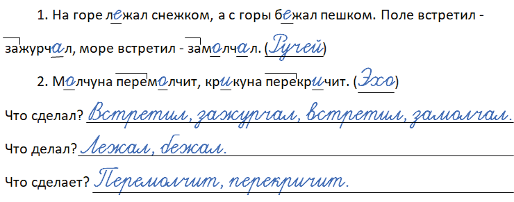 1. На горе л_жал снежком, а с горы б_жал пешком. Поле встретил - зажурч_л, море встретил - зам_лч_л. (___.)