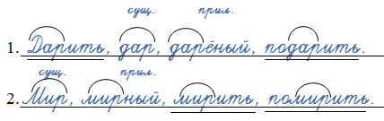 Выпишите из словаря однокоренных слов (учебник, с. 149) слова с корнями -дар- и -мир-. Выделите в них корень. Подчеркните глаголы в неопределённой форме. Над другими словами укажите часть речи.