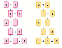 Записываю ответ в нужную клетку и читаю следующую строку 5 - 4, получаю 1 и записываю ответ в нужную клетку по стрелочке. Читаю 1 + 1 и записываю ответ 2 в последнюю клетку.