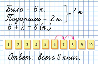 Рассматриваю схему: 6 зелёных квадратов - это 6 книг, которые были у Васи. А 2 жёлтых квадрата - это 2 книги, которые Васе подарили. Сколько всего квадратов? 8. Значит, у Васи стало 8 книг.