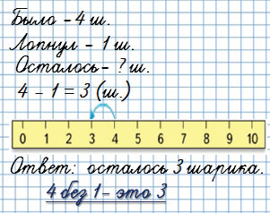 У Милы было 4 шарика. 1 шарик лопнул. Сколько шариков ... ?