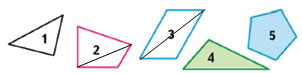 2) В каждом четырёхугольнике можно провести один отрезок так, чтобы получилось 2 треугольника. Покажи, как это можно сделать.