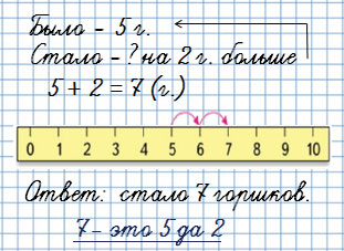 2. На окне стояло 5 горшков с цветами. По­том их стало на 2 больше. Сколько горшков с цветами теперь на окне?