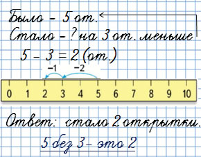 3. У Жени было 5 новогодних открыток. После Нового года у него стало на 3 от­крытки меньше. Сколько открыток теперь у Жени?