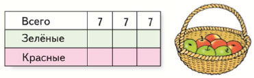 7. В корзине были яблоки: красные и зелёные, всего 7 яблок. Зелёных яблок было меньше, чем красных. Покажи с помощью таблицы, сколько красных и сколько зелёных яблок могло быть в корзине.