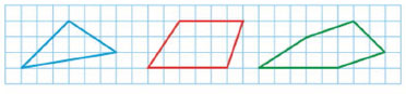 Фигура 2 - четырёхугольник: Ставлю точку 1 - шагаю вверх на 3 клеточки и вправо на 2 клеточки. Ставлю точку 2. От точки 2 шагаю вправо на 4 клеточки, ставлю точку 3. От точки 3 шагаю вниз на 3 клеточки и влево на 1 клеточку. Ставлю точку 4. Соединяю точку 1 с точкой 2, точку 2 с точкой 3 и точку 3 с точкой 4, точку 4 с точкой 1.