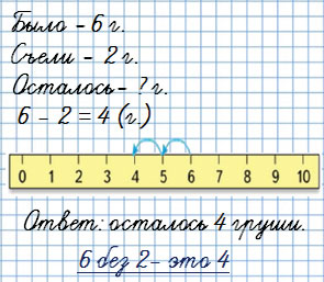 В вазе было 6 груш. За обедом 2 груши съели. Сколько груш осталось в вазе?