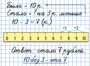 5. У Васи было 10 р. После того как он купил блокнот, денег у него стало на 3 р. меньше. Сколько рублей теперь у Васи?