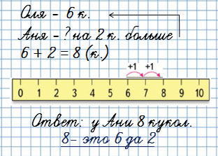 Добавляю условие: Оля раскрасила 6 кукол. Аня - на 2 куклы больше. Сколько кукол раскрасила Аня?