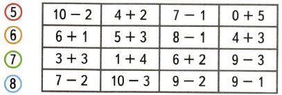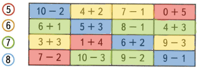 Реши примеры и раскрась карточки с ответами 5 красным цветом, с ответом 6 - жёлтым, с ответом 7 - зелёным, а с ответом 8 - синим цветом.