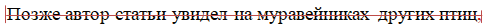 Оказывается, на муравьиных кучах птицы освобождаются от паразитов. Муравьи быстро "вычёсывают" всё, что скопилось под перьями. Учёные подметили: примерно половина птиц принимает муравьиные ванны.
