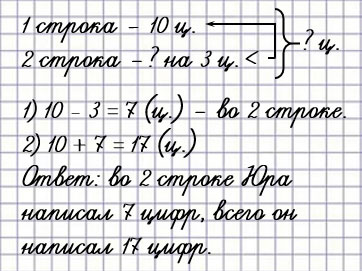 5. Юра написал в первой строке 10 цифр, а во второй — на 3 цифры меньше. Сколько цифр он написал во второй строке? Сколько всего цифр написал Юра?