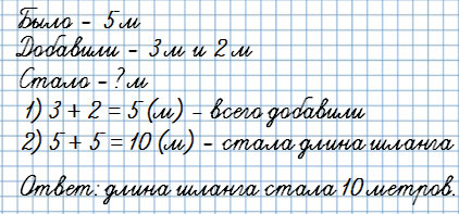3. К шлангу длиной 5 м присоединили с одной стороны шланг длиной 3 м, а с другой — шланг длиной 2 м. Какой длины стал шланг?