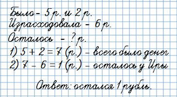 4. У Иры было две монеты: 5 р. и 2 р. На покупку тетрадей она израсходовала 6 р. Сколько рублей осталось у Иры?