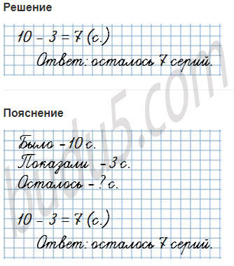5. Мультфильм, который начали показывать по телевизору, состоит из 10 серий. Показали уже 3 серии. Сколько серий осталось показать?
