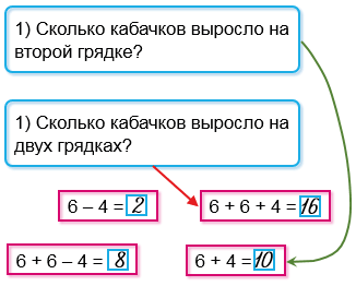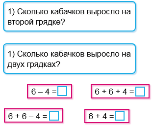 Условие. На первой грядке выросло 6 кабачков, а на второй - на 4 кабачка больше.