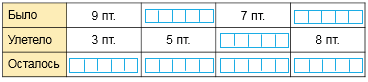 Составь по таблице четыре задачи про птиц, заполняя окошки своими числами. Запиши ответ каждой задачи в третьей строке таблицы.