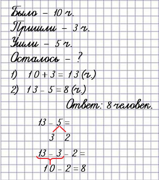 На катке было 10 человек. Пришли ещё 3 человека. Сколько человек стало на катке? На катке было 13 человек. С катка ушли 5 человек. Сколько человек осталось на катке?