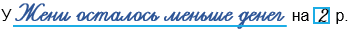У Жени было денег столько же, сколько у Саши. Саша купил альбом за 20 р., а Женя — краски за 22 р. У кого из мальчиков осталось меньше денег и на сколько рублей?