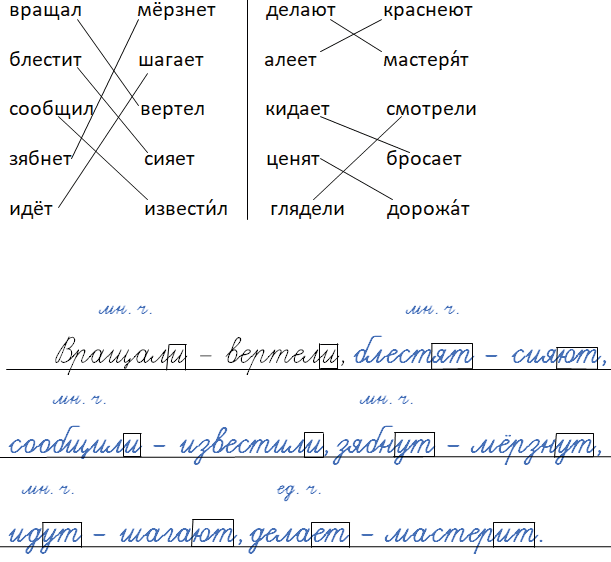 Прочитайте. Определите число глаголов. Соедините линиями глаголы-синонимы.
