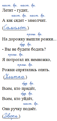 Поработайте в парах. Прочитайте загадки. Отгадайте их. Запишите отгадки. Объясните как определить время каждого глагола. Укажите время глаголов (наст. вр., прош., вр., буд. вр.)