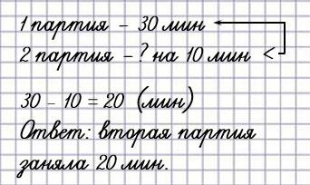 3. Мальчики играли в шахматы. Первая партия заняла у них 30 мин, а на вторую они затратили на 10 мин меньше. Сколько времени заняла вторая партия?
