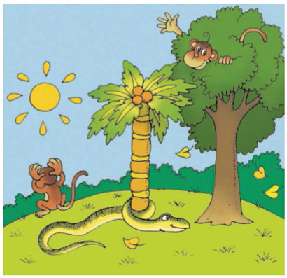 1. Играя в прятки со своей подругой, обезьянка пробе­жала 5 м по спине змеи и взобралась на самый верх пальмы, под которой отдыхала змея.