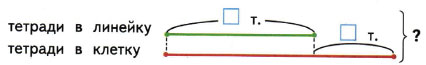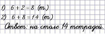 На столе было 6 тетрадей в линейку, а в клетку на 2 тетради больше. Сколько всего тетрадей в линейку и в клетку было на столе?