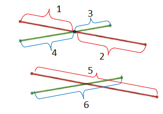 Рассматриваю чертёж и вижу, что два отрезка пересеклись в одной точке, и каждый отрезок разделился на 2 отрезка.