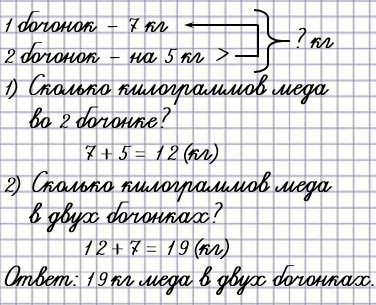 В первом бочонке 7 кг мёда, а во втором на 5 кг больше. Сколько всего килограммов мёда в этих бочонках?