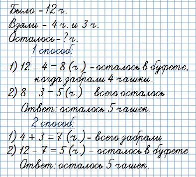 2. В буфете было 12 чашек. Из этих чашек на стол поставили сначала 4 чашки, а потом ещё 3 чашки. Сколько чашек осталось в буфете?
