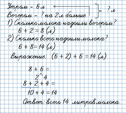 Утром надоили от коровы 6 л молока, а вечером - на 2 л больше. Сколько литров молока надоили утром и вечером вместе?