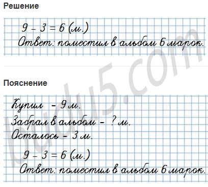 2. Алёша купил 9 новых марок. После того как он поместил в альбом несколько марок, у него осталось 3 марки. Сколько марок Алёша поместил в альбом?