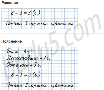 2. На подоконнике было 8 горшков с цветами. Несколько горшков переставили на соседнее окно, и на подоконнике осталось 5 горшков с цветами. Сколько горшков с цветами переставили на соседнее окно?