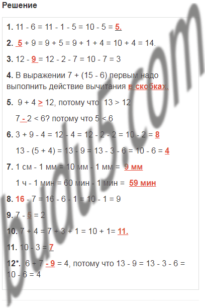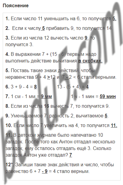 1. Если число 11 уменьшить на 6, то получится 2. Если к числу 3. Если из числа 12 вычесть число 4. В выражении 7 + (15 - 6) первым надо выполнить действие вычитания ___________________. 5. Поставь такие знаки действий, чтобы неравенства 9 + 4 >12 и 7 - 2 < 6 стали верными. 6. 3 + 9 - 4 = 7. 1 см - 1 мм = 8. Если из числа 9. Уменьшаемое 7, разность 2, вычитаемое 10. Если число 7 увеличить на 4, то получится 11. В детском журнале было напечатано 10 загадок. После того как Антон отгадал несколько загадок, ему осталось отгадать ещё 3. Сколько загадок Антон уже отгадал? 12∗. Запиши такие знак действия и число, чтобы равенство 6 + 7 |