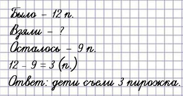 На тарелке лежали 12 пирожков. Дети взяли и съели несколько пирожков, тогда на тарелке осталось 9 пирожков. Сколько пирожков съели дети?