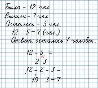 1) В вагоне электрички ехало 12 человек. После того, как на остановке вышли несколько человек, в вагоне осталось 5 пассажиров. Сколько человек вышло на остановке?