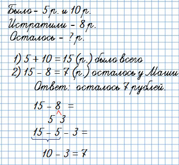 У Маши было две монеты в 5 рублей и 10 рублей. Она истратила 8 рублей. Сколько рублей осталось у Маши?