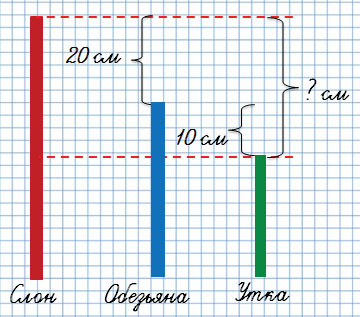 8. У Пети три игрушки: обезьяна, утка и слон. Петя определил, что шаг обезьяны 15 см, утки на 10 см короче, а слона на 20 см длиннее, чем обезьяны. На сколько сантиметров шаг утки короче шага слона? Реши задачу двумя способами.