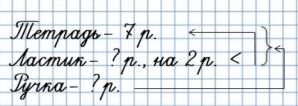 Тетрадь стоит 7 р., ластик - 5 р. Узнаем, сколько стоит ручка: