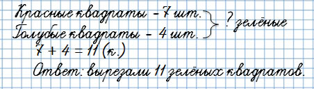 2. Даша вырезала 7 красных квадратов, 4 голубых, а зелёных столько, сколько красных и голубых вместе. Сколько зелёных квадратов вырезала Даша?