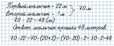 1. Длина аллеи 70 м. Два мальчика пошли навстречу друг другу с разных концов аллеи. Один мальчик прошёл до встречи 22 м. Сколько метров прошёл до встречи другой мальчик?