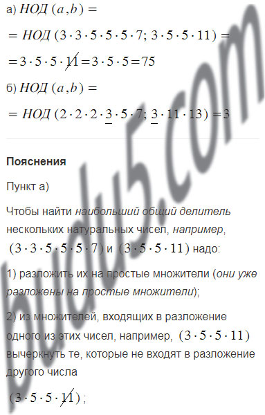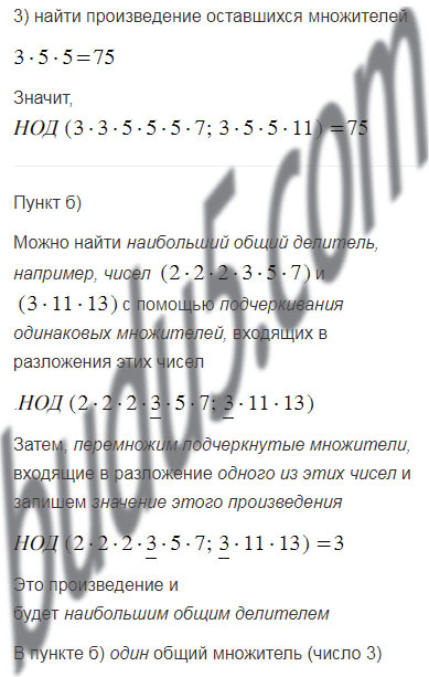 Вспомните, что для нахождения наибольшего общего делителя (НОД) нескольких натуральных чисел, надо: 1) разложить их на простые множители; 2) из множи­телей, входящих в разложение одного из этих чисел, вычеркнуть те, которые не входят в разложение других чисел; 3) найти произ­ведение оставшихся множителей.