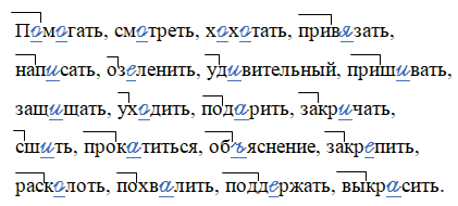 П_м_гать, см_треть, х_х_тать, прив_зать, нап_сать, оз_ленить, уд_вительный, приш_вать, защ_щать, ух_дить, под_рить, закр_чать, сш_ть, прок_титься, об_яснение, закр_пить, раск_лоть, похв_лить, подд_ржать, выкр_сить.