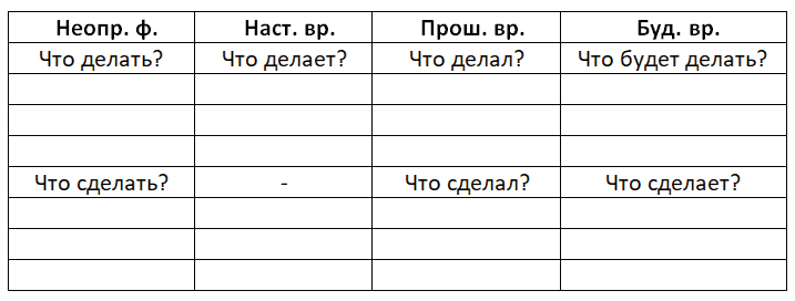 | Неопр. ф. | Наст. вр. | Прош. вр. | Буд. вр. |